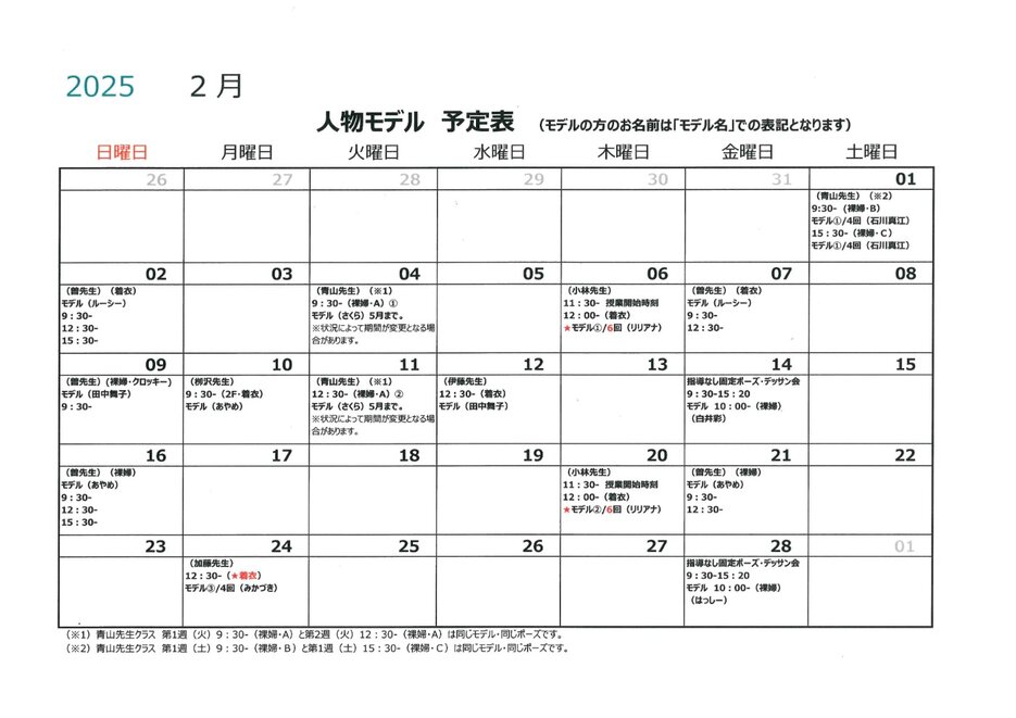 【修正版】2025年2月の人物モデル教室、指導なしデッサン会スケジュールを掲示します。