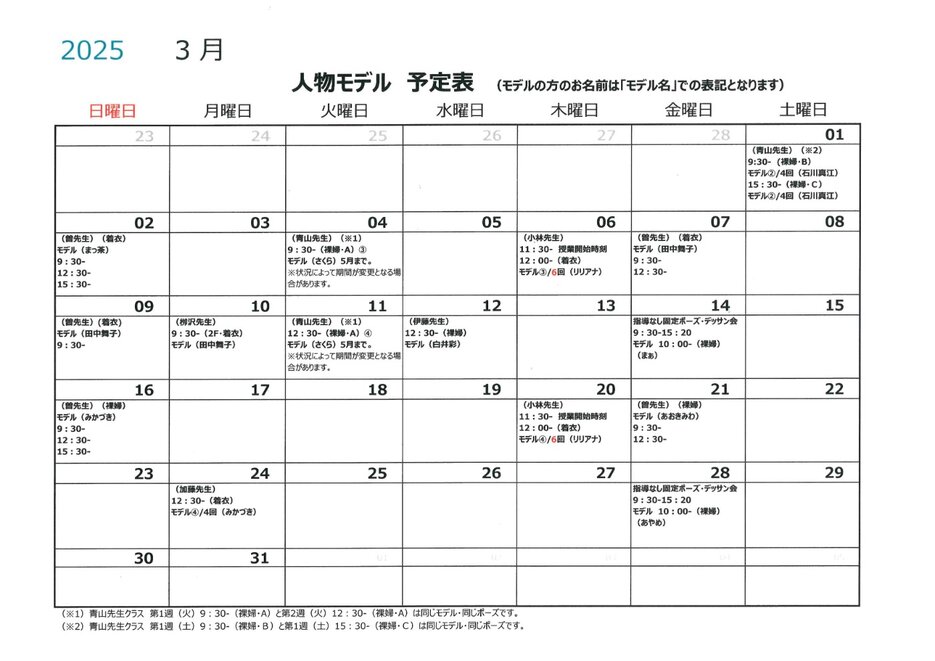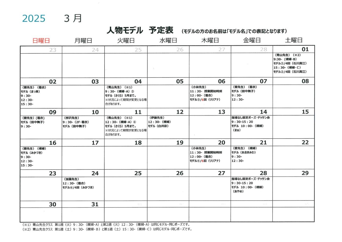 令和7年3月人物モデル教室・人物デッサン会情報 2025/02/11 | 会員様へのご案内 | #人物デッサン #裸婦モデル #着衣モデル #デッサン会 #デッサン 2025年3月の人物モデル教室、指導なしデッサン会のスケジュールを掲示します。 教室出席のご参考になさってください。 ※モデルの方のお名前は「モデル名」での表記となります。