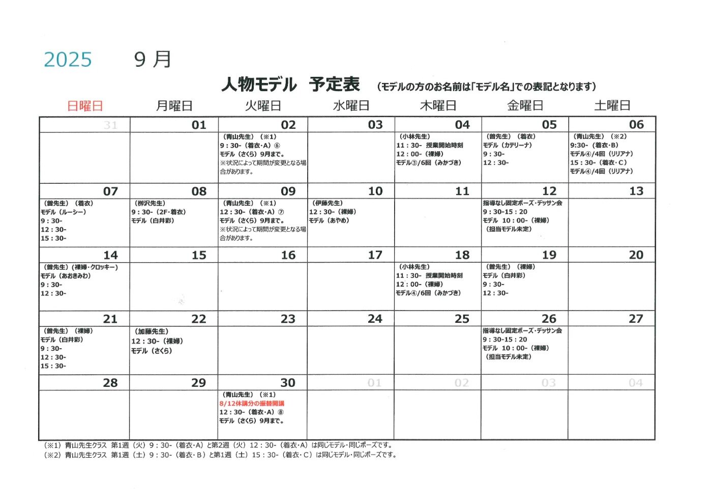 令和7年9月人物モデル教室・人物デッサン会情報 2025/08/14 | 会員様へのご案内 | #人物デッサン #裸婦モデル #着衣モデル #デッサン会 2025年9月の人物モデル教室、指導無しデッサン会のスケジュールを掲示します。 教室出席のご参考になさってください。 ※モデルのお名前は「モデル名」での表記となります。