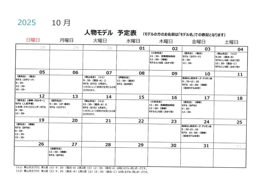 令和7年10月人物モデル教室・人物デッサン会情報 2025/09/12 | 会員様へのご案内 | #人物デッサン #裸婦モデル #着衣モデル #デッサン会 2025年10月の人物モデル教室、指導無しデッサン会のスケジュールを掲示します。 教室出席のご参考になさってください。 ※モデルのお名前は「モデル名」での表記となります。