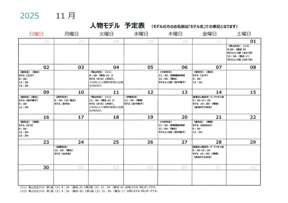 令和7年11月人物モデル教室・人物デッサン会情報 2025/10/09 | 会員様へのご案内 | #人物デッサン #裸婦モデル #着衣モデル #デッサン会 2025年11月の人物モデル教室、指導無しデッサン会のスケジュールを掲示します。 教室出席のご参考になさってください。 ※モデルのお名前は「モデル名」での表記となります。