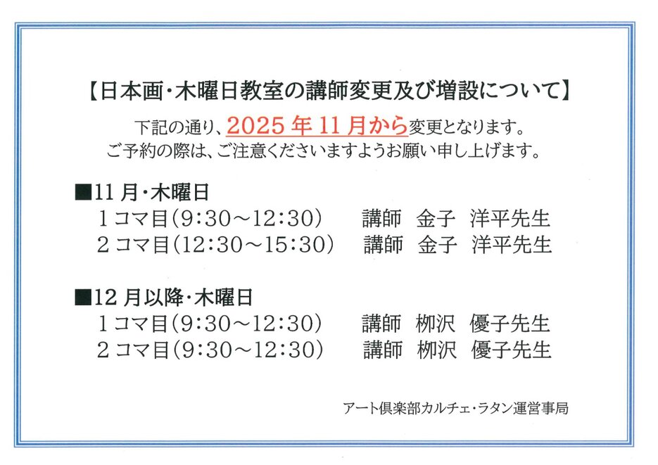 木曜日・日本画教室の講師変更及び増設について 2025/10/14 | 会員様へのご案内 | #日本画教室 【日本画・木曜日教室の講師変更及び増設について】 下記の通り、2025年11月から変更となります。 ご予約の際は、ご注意くださいますようお願い申し上げます。 ■11月・木曜日 1コマ目(9:30~12:30) 講師 金子 洋平先生 2コマ目(12:30~15:30) 講師 金子 洋平先生 ■12月以降・木曜日 1コマ目(9:30~12:30) 講師 栁沢 優子先生 2コマ目(9:30~12:30) 講師 栁沢 優子先生 ※2025年11月から、1コマ目(9:30~12:30)の日本画教室が増設されます。 アート倶楽部カルチェ・ラタン運営事局