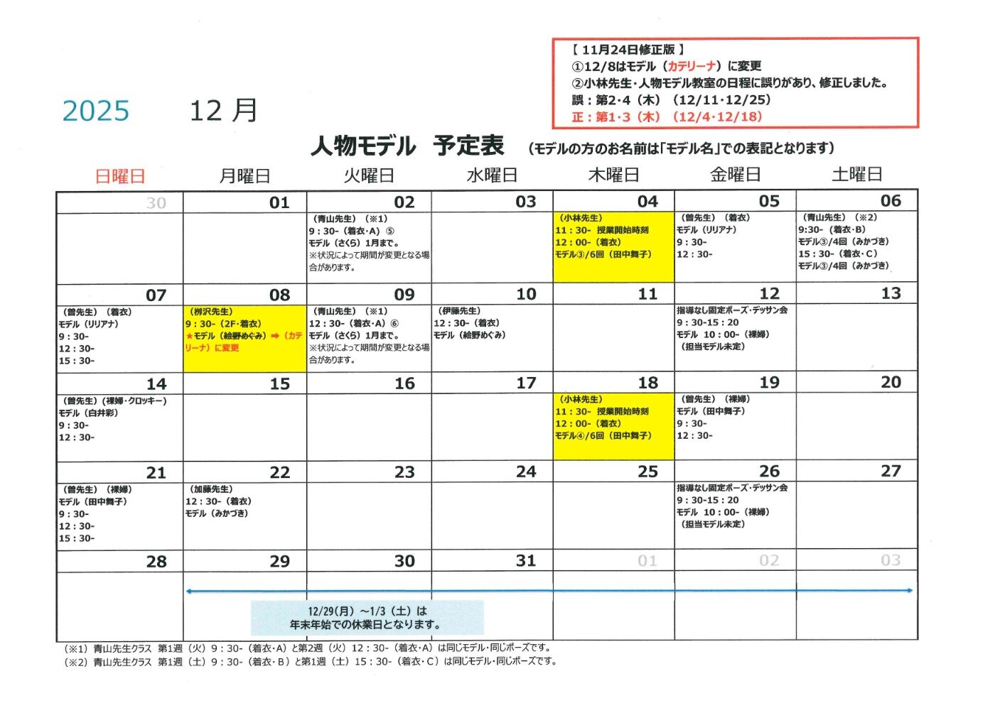 【11/24修正版】2025年12月の人物モデル教室、指導なしデッサン会のスケジュールを掲示します。