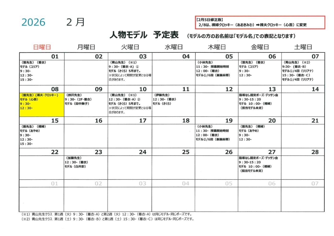 (2/5修正版)令和8年2月人物モデル教室・人物デッサン会情報 2026/02/06 | 会員様へのご案内 | #人物デッサン #裸婦モデル #着衣モデル #デッサン会 【2/5修正版】2026年2月の人物モデル教室・指導なしデッサン会のスケジュールを掲示します。 ★修正箇所 2/8(日)9:30-、12:30-の曽先生・人物モデル教室の担当モデルに変更があります。 裸婦クロッキー(あおきみわ) ↓ 裸夫クロッキー(心吾)※男性モデルです。 変更に際しご迷惑をお掛けしておりますこと、深くお詫び申し上げます。 何卒ご理解賜りますようお願い申し上げます。 ※モデルの方のお名前は「モデル名」での表記となります。 以上、ご確認の程、何卒宜しくお願い申し上げます。
