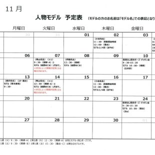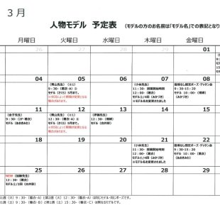 2025年3月の人物モデル教室、指導なしデッサン会のスケジュールを掲示します。 教室出席のご参考になさってください。 ※モデルの方のお名前は「モデル名」での表記となります。
