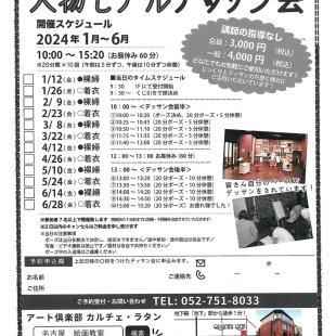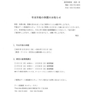 1.令和6年度 年末年始の休業 〇2024年12月29日(日)~2025年1月3日(金) (教室・アトリエ・受付共に休業いたします。) 2.教室の振替開講日 〇1月1日(水)お休み→ 1月29日(水)振替開講 〇1月2日(木)お...