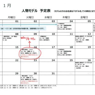 2025年1月の人物モデル教室、指導なしデッサン会スケジュールを掲示します。 教室出席のご参考になさってください。 ※モデルの方のお名前は「モデル名」での表記となります。 ※2025年1月から、第3週(火)1コマ目...
