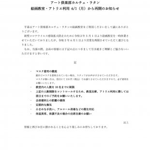 アート倶楽部カルチェ・ラタンの規約につきまして、2023年11月27日に改定いたしました。 受付にて、改訂した規約を配布をしております。 ご確認くださいますようお願いいたします。 アート倶楽部カルチェ・ラタン...