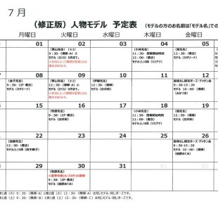 【7/1修正版】2025年7月の人物モデル教室、指導なしデッサン会のスケジュールを掲示します。 ★修正箇所:7/31(木)に小林先生の人物モデル教室を追加しました。 ※7/31(木)は、夏季休業日(8/21)の振替開講日...