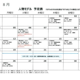 2025年8月の人物モデル教室、指導無しデッサン会のスケジュールを掲示します。 教室出席のご参考になさってください。 ※モデルのお名前は「モデル名」での表記となります。 ※2025年8月から、第4週(月)加藤茂外...