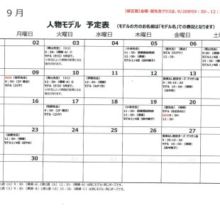 2025年9月の人物モデル教室、指導無しデッサン会のスケジュールを掲示します。 教室出席のご参考になさってください。 ※モデルのお名前は「モデル名」での表記となります。