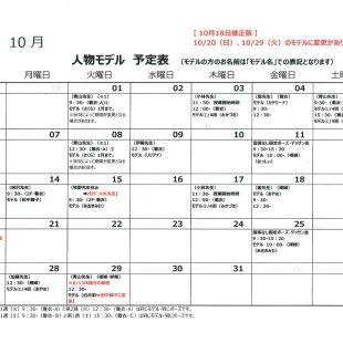 2025年10月の人物モデル教室、指導無しデッサン会のスケジュールを掲示します。 教室出席のご参考になさってください。 ※モデルのお名前は「モデル名」での表記となります。