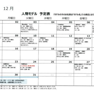 【11/24修正版】2025年12月の人物モデル教室、指導なしデッサン会のスケジュールを掲示します。 ★修正箇所 ①12/8(月)9:30-(2F・着衣)の栁沢先生・人物モデル教室の担当モデルに変更があります。 モデル(絵...