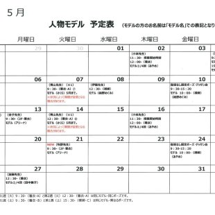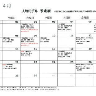 2025年3月の人物モデル教室、指導なしデッサン会のスケジュールを掲示します。 教室出席のご参考になさってください。 ※モデルの方のお名前は「モデル名」での表記となります。