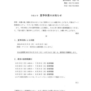 令和6年の夏季休業に伴う休館日及び教室の振替開講日につきまして、下記の通りご案内申し上げます。 1.夏季休業による休館 2024年8月19日(月)~8月23日(金) (教室・アトリエ・受付共に全館休館いたします...