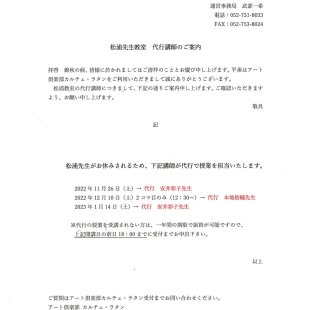 松浦先生教室 代行講師のご案内 松浦先生がお休みされるため、下記講師が代行で授業を担当いたします。 2022年11月26日(土)→ 代行 安井彩子先生 2022年12月10日(土)2コマ目のみ(12:30~)→ 代行 本地裕輔先...