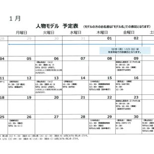 2026年1月の人物モデル教室、指導無しデッサン会のスケジュールを掲示します。 教室出席のご参考になさってください。 ※モデルのお名前は「モデル名」での表記となります。