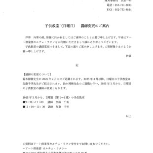子供教室(日曜日) 講師変更のご案内 平素はアート倶楽部カルチェ・ラタンをご利用いただきまして誠にありがとうございます。 子供教室の講師変更つきまして、下記の通りご案内申し上げます。ご理解賜りますよう...