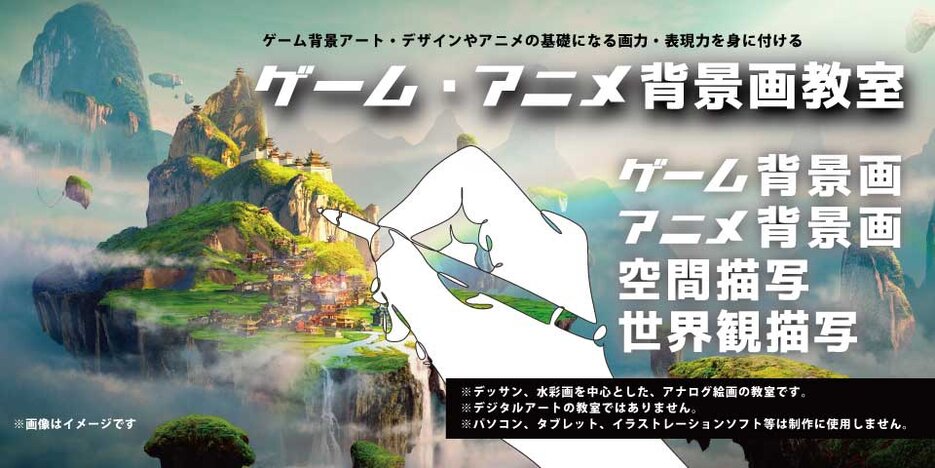 ・ パソコンやiPad、CGソフトなどを使った教室ではありません。ゲーム背景画やアニメ背景画などの基礎となる、「手で描く」力を養う教室です。
